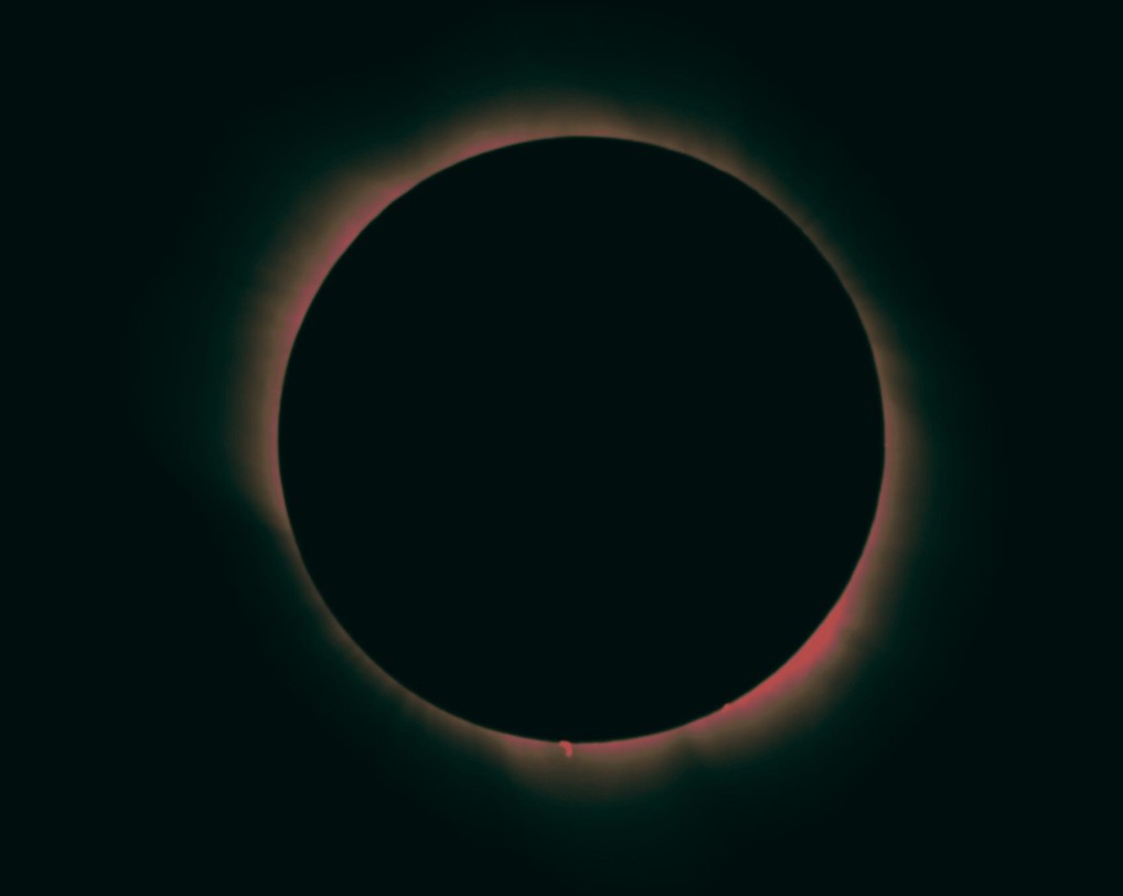 Mon réglage de sensibilité (400 ISO au moment de la totalité) était un peu trop fort pour les protubérances. J'ai quand même pu obtenir une image par traitement avec Iris.
