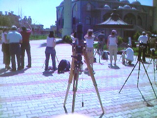 J'étais prés de Side à Colaçli exactement. Le temps a été superbe, sauf quelques nuages légers d'altitude vers la fin. Mes impressions : Je n'ai pas eu l'impression d'une ombre qui avance comme en 99. Plutôt une baisse continue de la lumière comme avec un variateur. Sinon, je crois que j'étais un peu dans un état second, Parce-que j'ai complètement perdu la notion du temps. En fait, j'ai vraiment eu l'impression que cela durait pas plus de 30 s. J'ai pris le temps de jeter un coup d'oeil autour pour apprécier les couleurs du crépuscule (à 360°), j'ai vu vénus. Je n'ai pas fait de photo d'ambiance parce-que j'étais avec un groupe qui en a fait et aussi un film. Je vous ferais profiter des meilleures dès que je les aurais. Je crois que je suis resté assez longtemps scotché à l'oculaire. c'était impressionnant.Et j'ai fait quelques photos, mais avec une sensibilité de 400 ISO, c'est bien pour la couronne mais trop pour les protubérances. C'est pas grave j'ai maintenant les temps de poses pour la prochaine