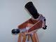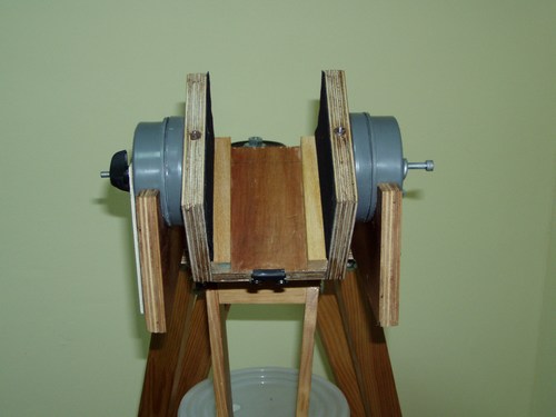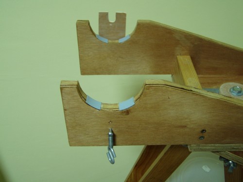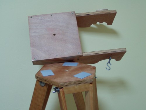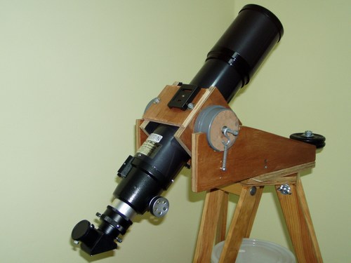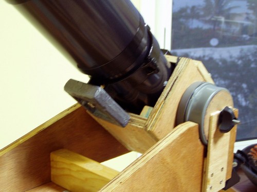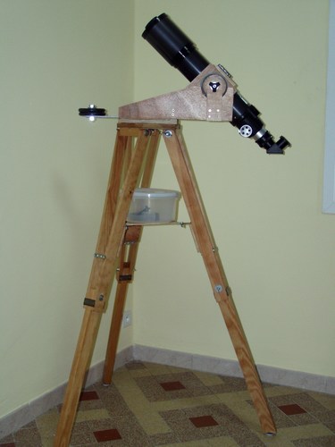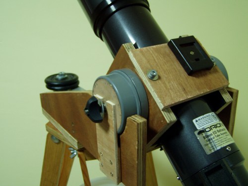 La fourche est en contre plaqué de 18 mm et le cube autour de la lunette en 12 mm. Les axes (tourillons) sont des bouchons de tube PVC renforcés par un disque en bois. Des poids de gym et une ferrure d'assemblage trouvée en magasin de bricolage assurent un bon équilibrage pour une rotation douce. |